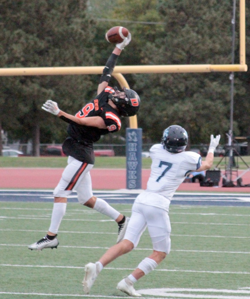 Following a 58-yard kick return by Carlson, Zawodny capped a wild first series on the field – he had two high snaps go over his head – by floating a perfect 33-yard touchdown strike to Carlson in stride in the end zone. That cut the Hi-Liners’ lead to 14-6.